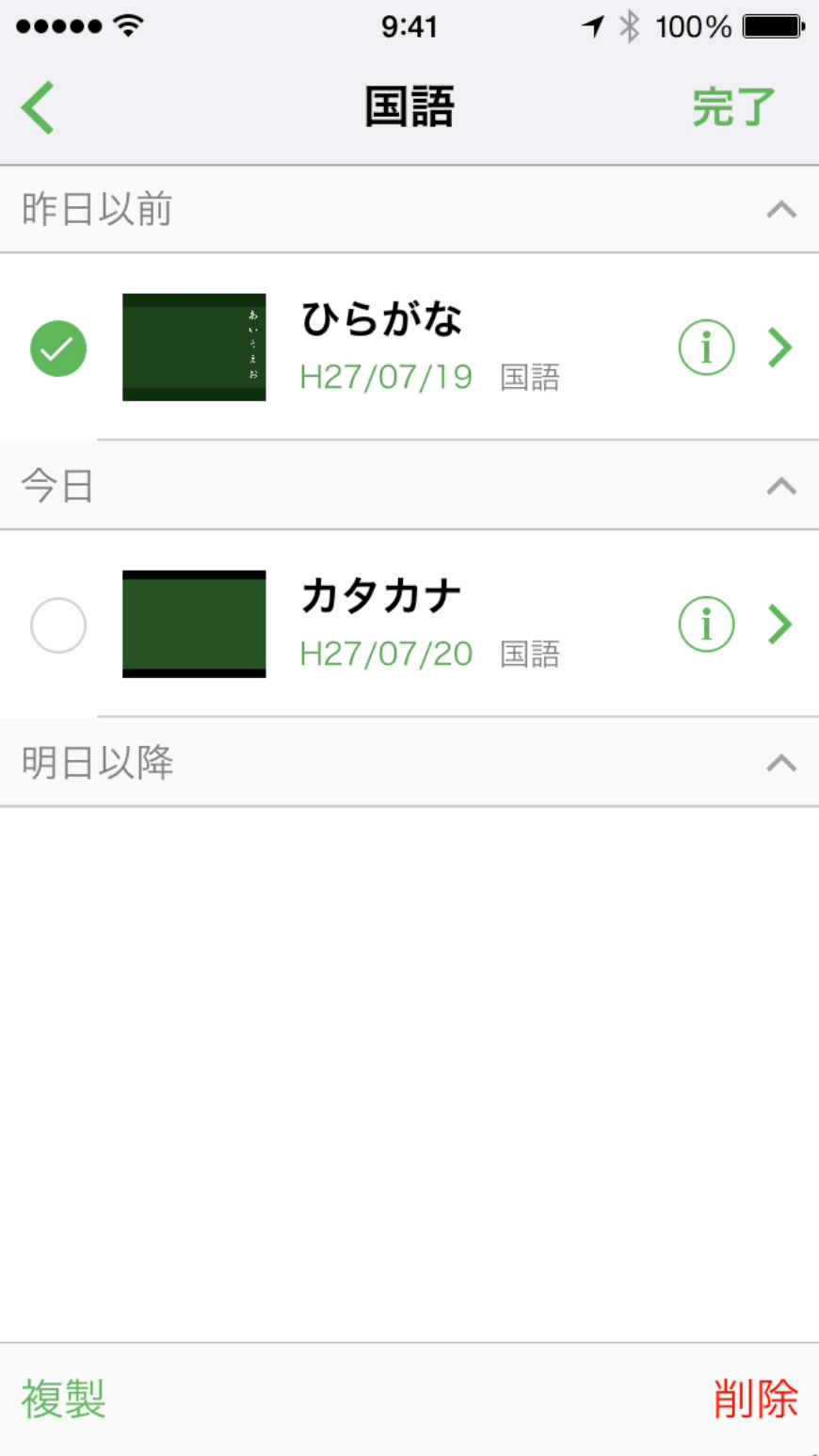 - 3 フォルダを削除するときは、右上の編集ボタンを押して、教科を選択し「delete」ボタンをタップします